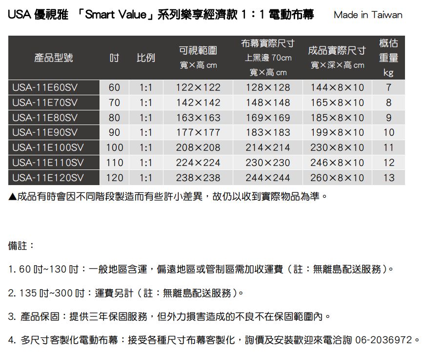 USA優視雅秉持「台灣製造」精神,全程由專業團隊監製,從鋁殼組裝、馬達校準到幕面平整測試,層層嚴格把關,確保品質穩定。產品享有三年原廠保固,提供完善的維修與售後服務,讓使用者購買更安心,長期使用更放心。