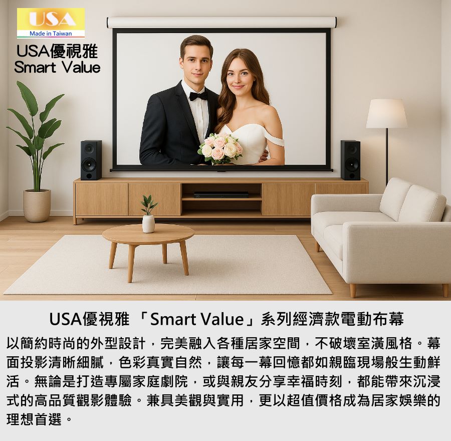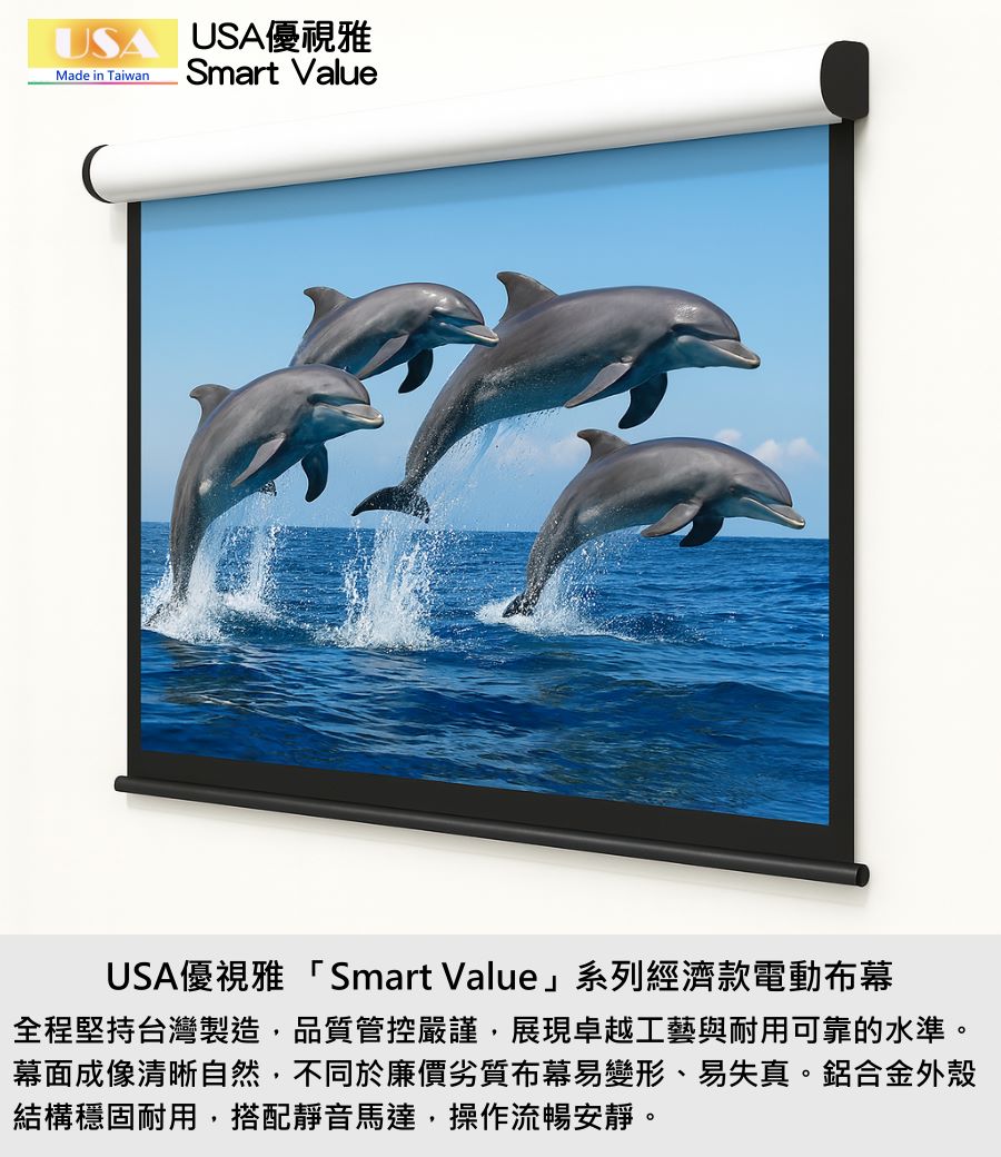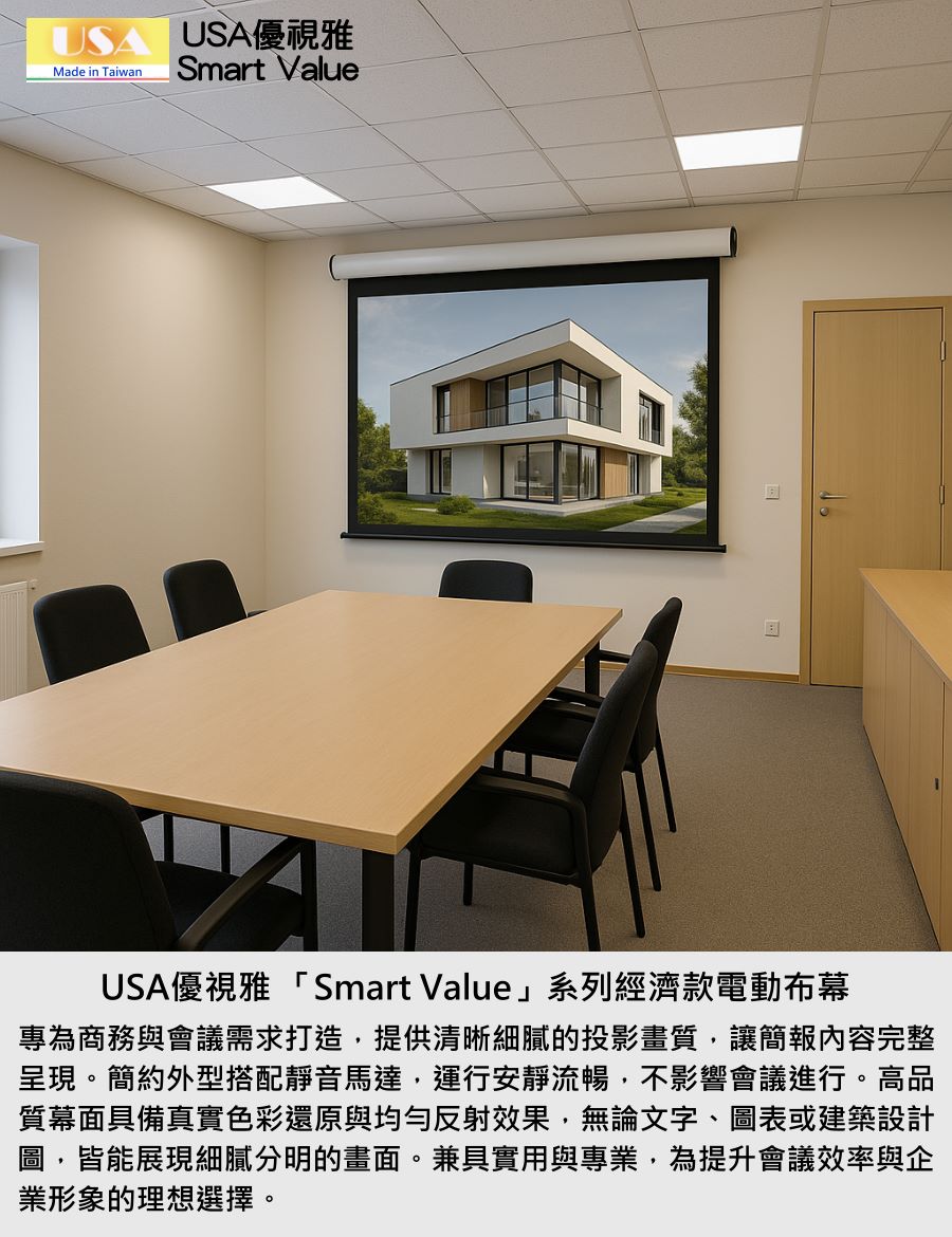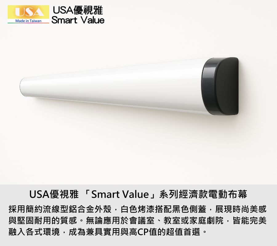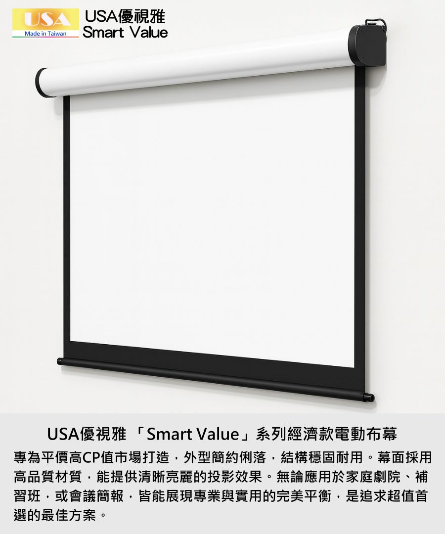 USA優視雅「Smart Value」系列完美結合高品質與高性價比,不僅價格親民,更具備穩定性能與時尚外型。無論居家、教育或企業用途,都能以實惠預算獲得專業級體驗,成為市面上最具競爭力的電動布幕選擇之一。