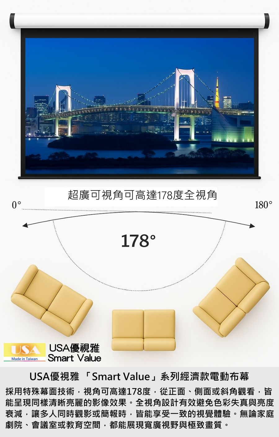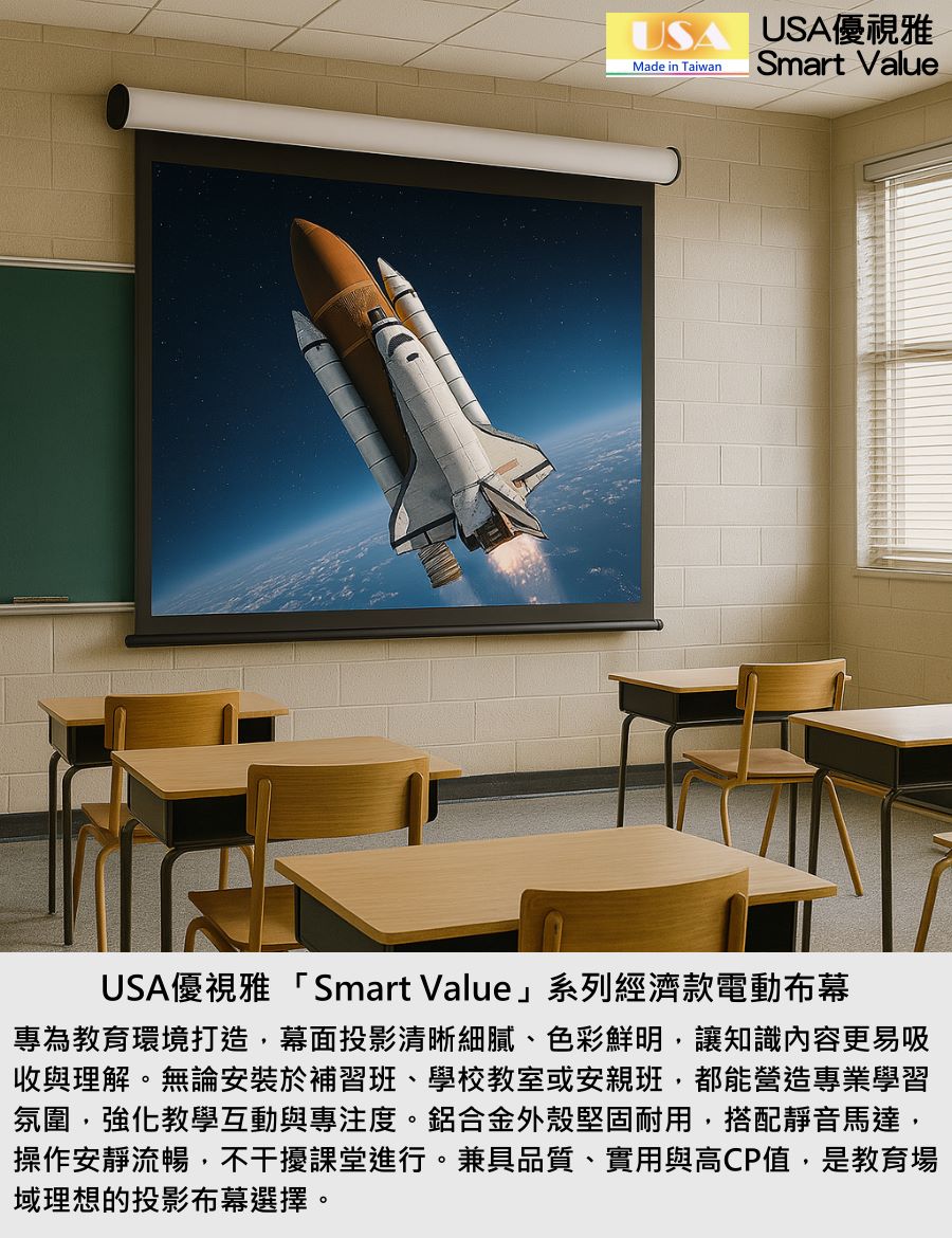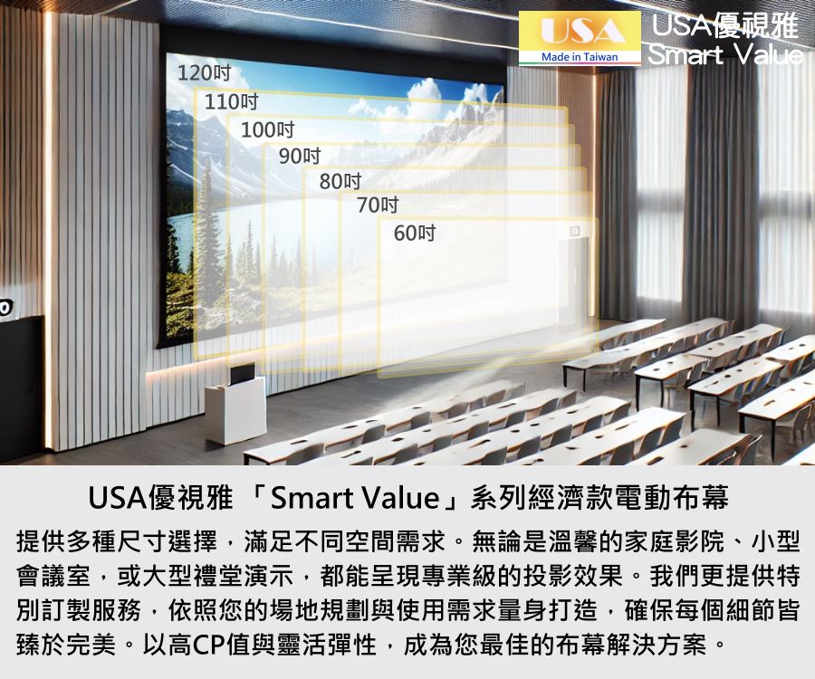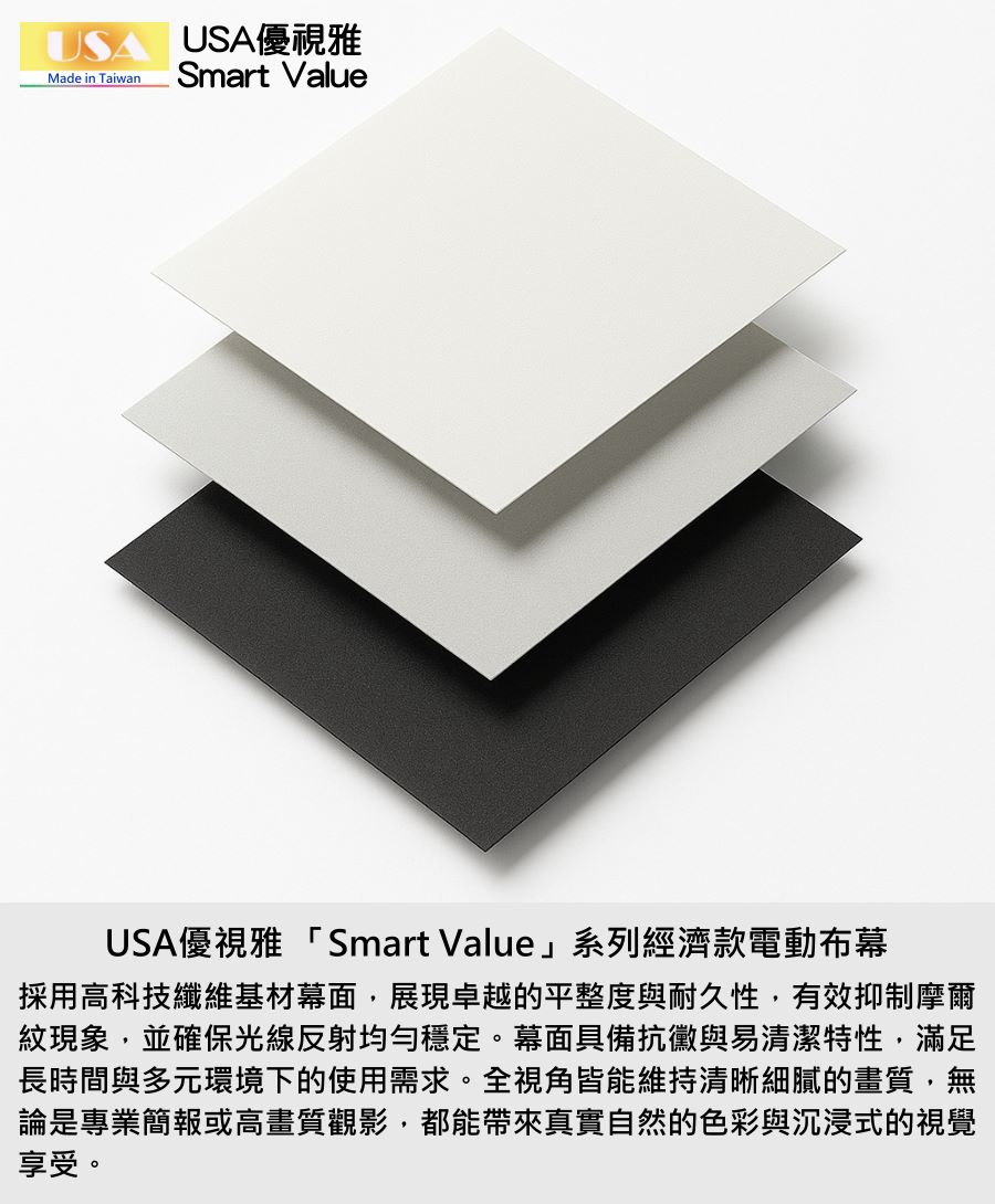 USA優視雅「Smart Value」系列完美結合高品質與高性價比,不僅價格親民,更具備穩定性能與時尚外型。無論居家、教育或企業用途,都能以實惠預算獲得專業級體驗,成為市面上最具競爭力的電動布幕選擇之一。